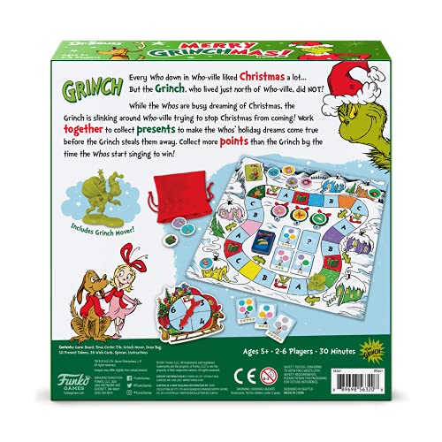 Bring Dr. Seuss’ Christmas classic to the family game table! Work together to collect presents and score goals. Includes fabric bag and sculpted Grinch mover. The Grinch moves around a beautifully illustrated Who-ville game board. Play with the entire family—up to 6 players!
