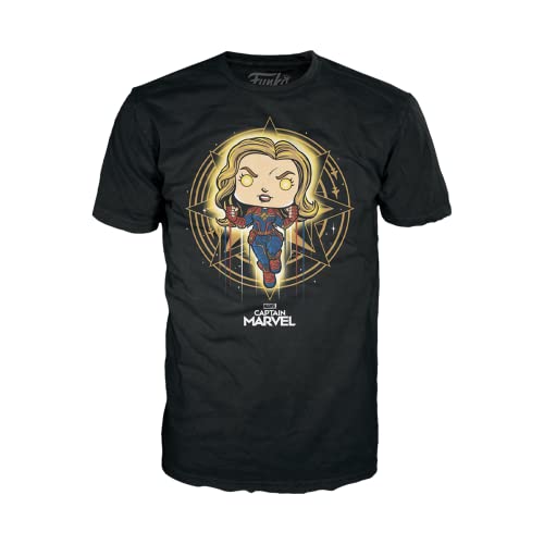 This comfy tee also pairs wear with a variety of casual bottoms, such as shorts, denim skirts, jeans, or joggers. For chillier weather, layer it with a long-sleeved button-down shirt. [Is it 100% cotton and does it glow in the dark?] Pocket Pop! Captain Marvel wears a neon suit that glows. Bring the Captain Marvel Pocket Pop! and Tee home to join forces and complete a powerful Marvel collection.